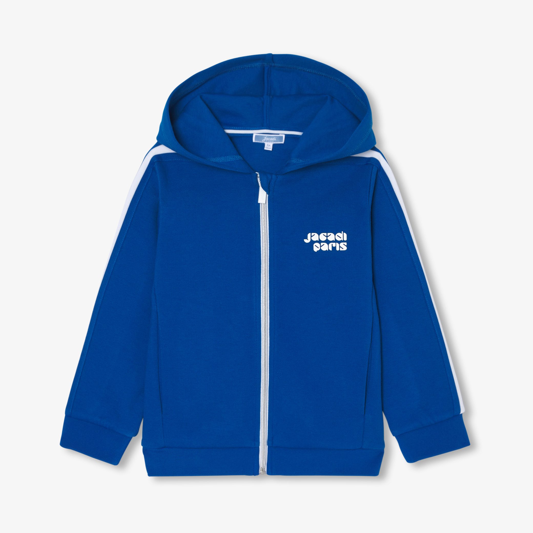 Jacadi sporty chic spirit shines through in this zip-up sweatshirt. The hood, contrasting piping on the sleeves and glossy logo on the chest give structure to this sporty, urban model, which can be worn with a polo shirt and coordinated joggers for a modern silhouette.