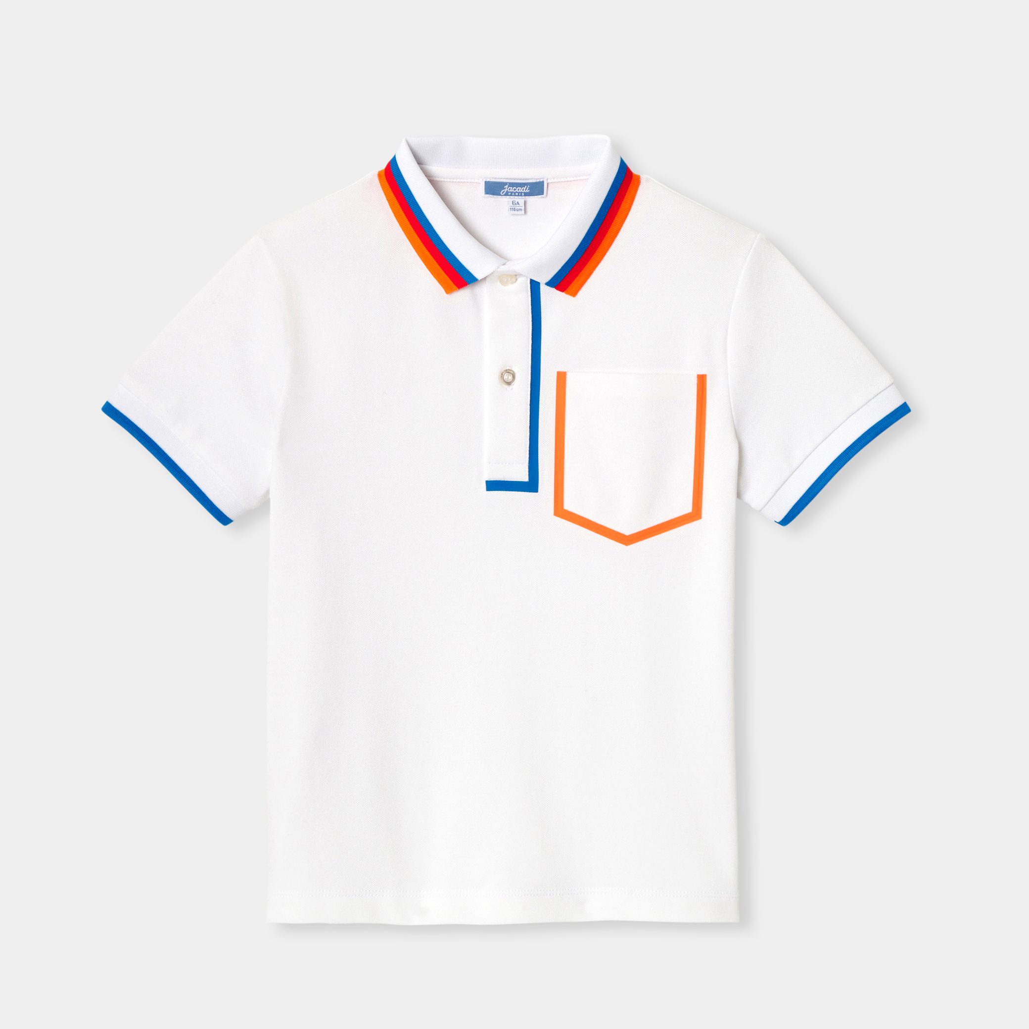 Whether in the city or on the playground, this boy polo will be part of every activity this season. Made from organic cotton piqué, with a striped collar, contrasting cuffs and patch pocket, this sporty-chic model will match rolled-up jeans for spring and shorts for summer.