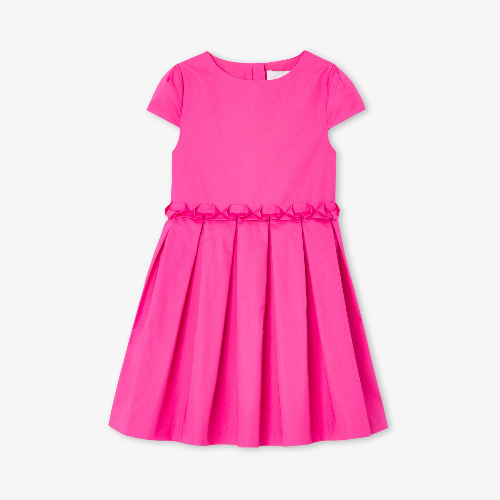 With its couture spirit and allure, this minimalist chic dress will be part of every ceremony. In pink satin, with short pleated sleeves, origami pleat detailing at the waist and a flared hemline, it is a resolutely elegant piece to match with sandals and a taffeta headband on the big day.