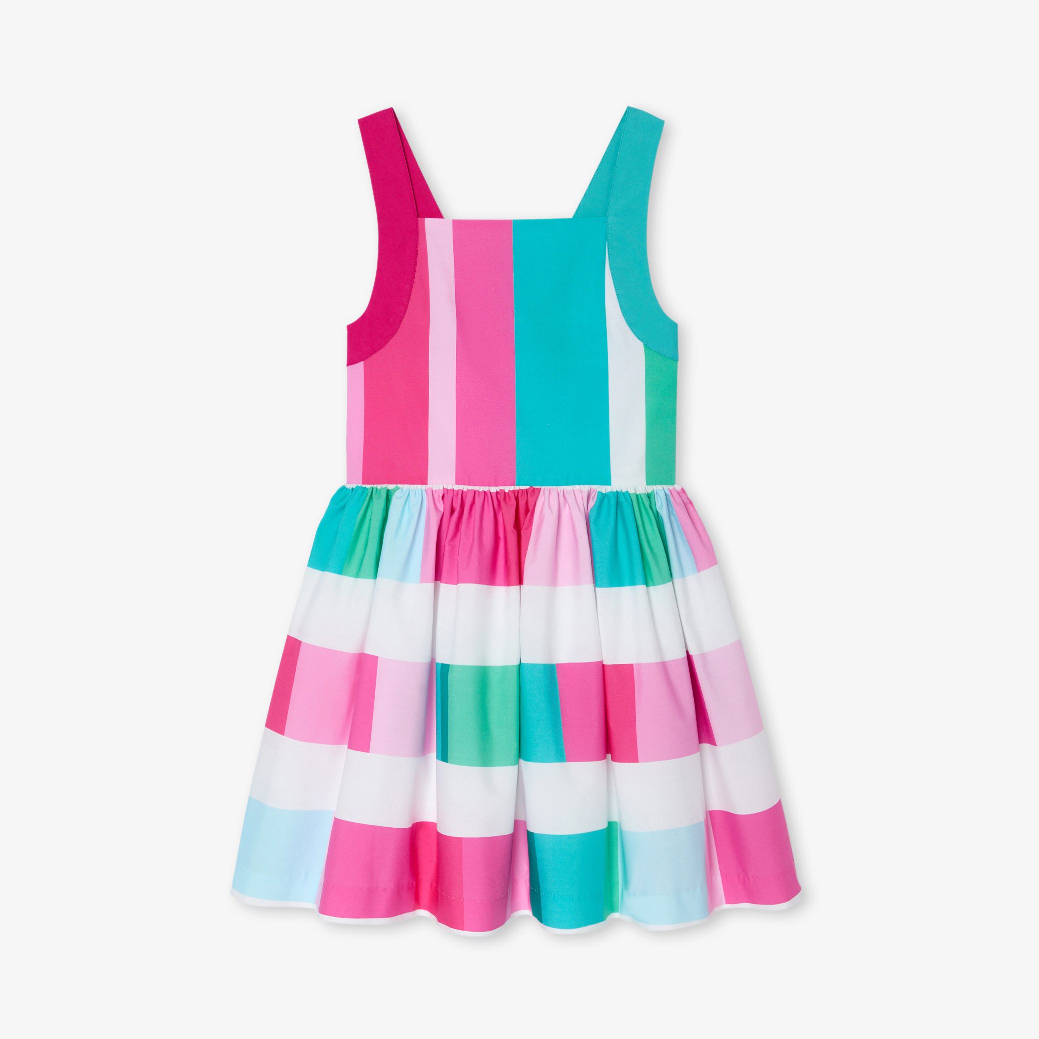 Mini, maxi, multicolour stripes set the tone this season with this girl dress. Printed on a soft, lightweight cotton poplin, with a gathered cutout at the waist and contrasting straps criss-crossed at the back, this hypnotic model is perfect for summer gift-giving.