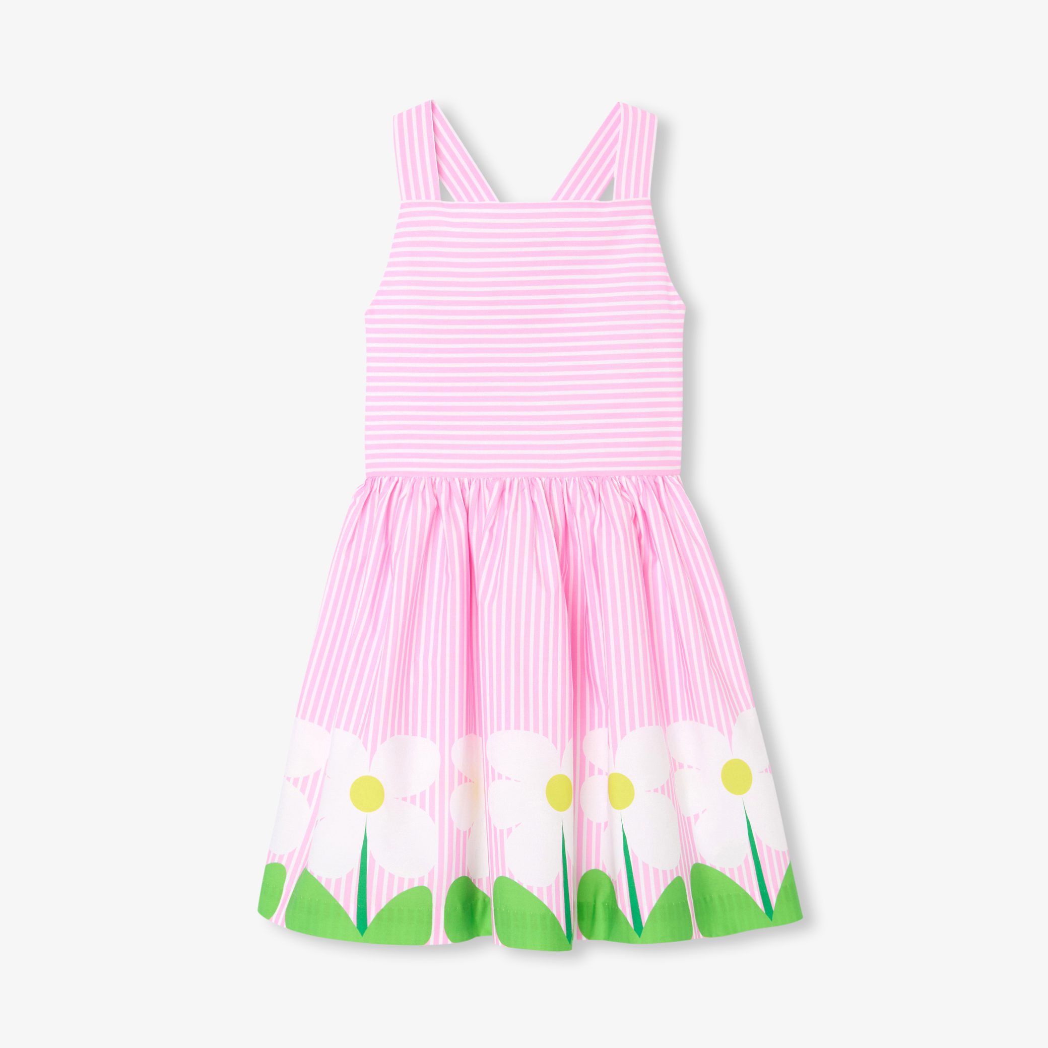 The Spring/Summer collection takes us on a journey to the heart of a sparkling, pop floral universe with this girl dress. Adorned with thin straps crossed at the back, its striped poplin is enlivened by maxi flowers placed at the base thanks to a new printing technique. A jewel of savoir-faire to wear on sunny summer days, it will quickly find its place in girls’ wardrobes.