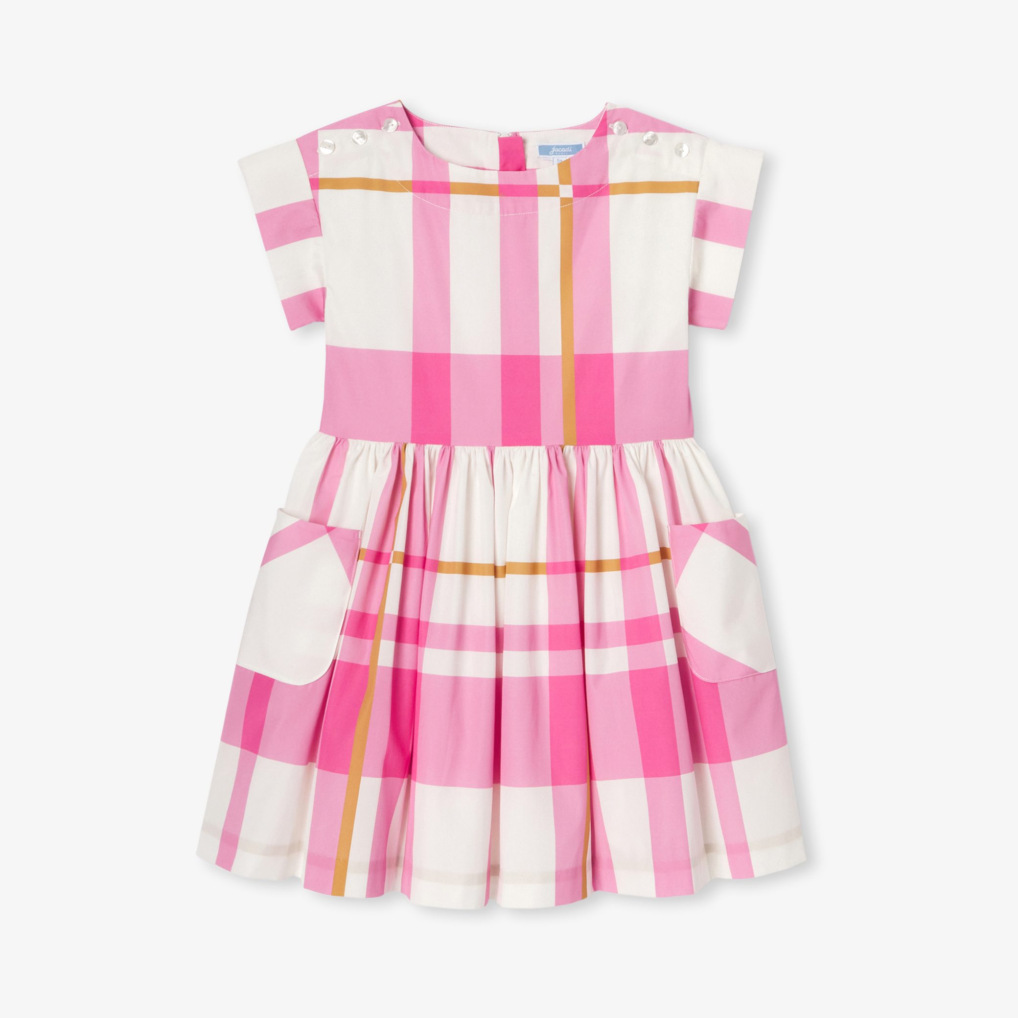 This season, the poplin girl dress opts for a geometric, structured look. Enlivened by oversized checks and a marked waist, gathers, shoulder buttons and pockets create a structured, elegant silhouette. Worn from late summer onwards, it lends itself equally well to a chic look or a casual silhouette.