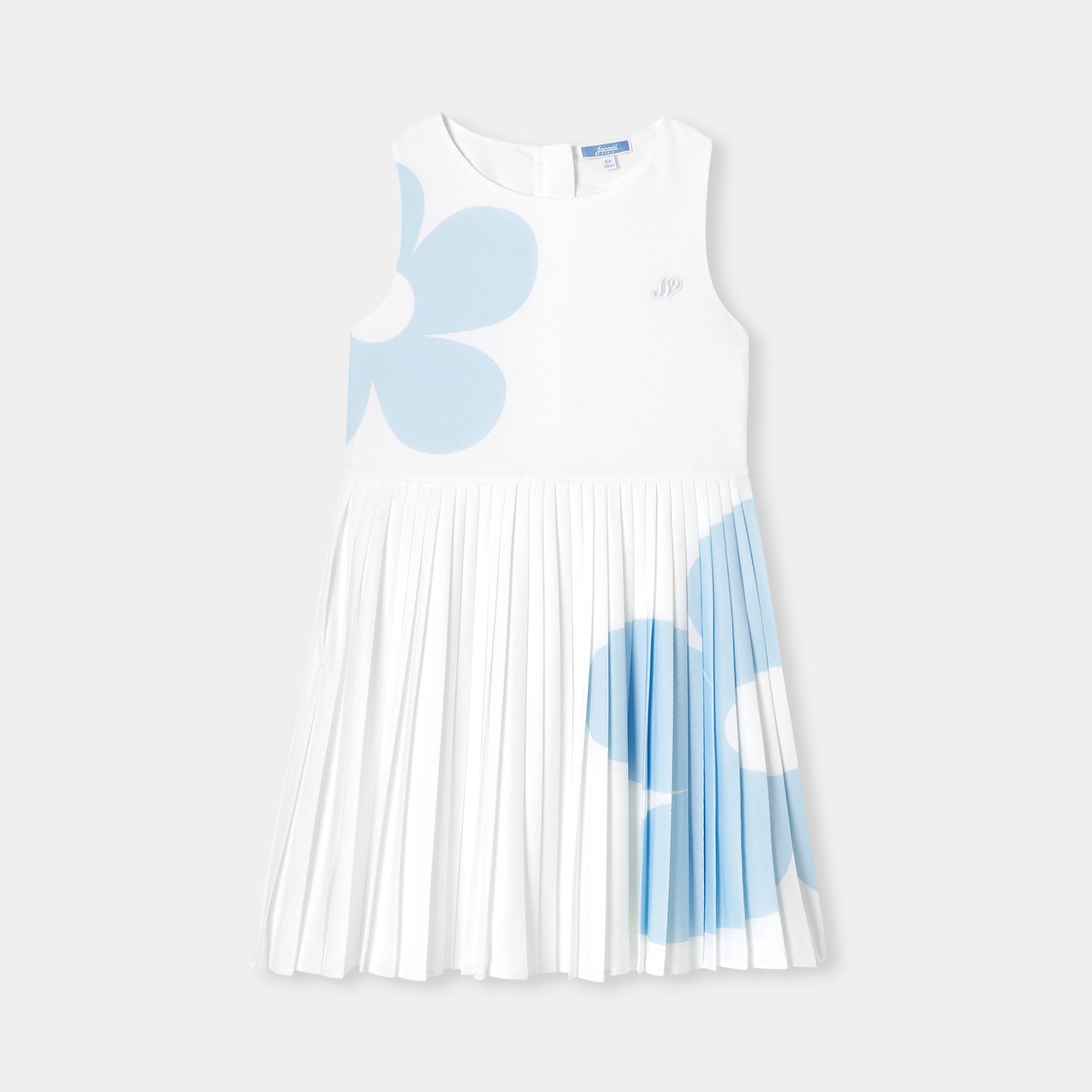 Inspired by the world of tennis, this girl dress becomes a chic, geometric preppy piece. In technical piqué knit, maxi pop flowers and a permanent pleated base sublimate this model to be worn with a seersucker jacket and Mary Janes for the start of the season.