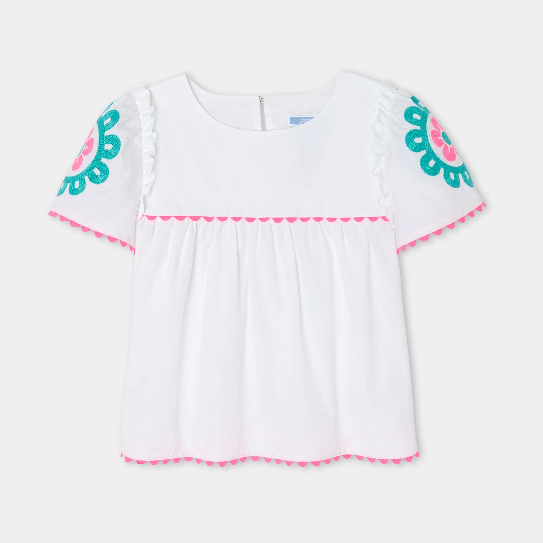 A must-have piece for the spring wardrobe, this timeless white blouse will transport your little girl’s looks into a colourful folk universe. Flounced at the shoulders, embroidered with rosettes and highlighted with fuchsia croquet ribbons, you’ll love it for all its fashionable details.