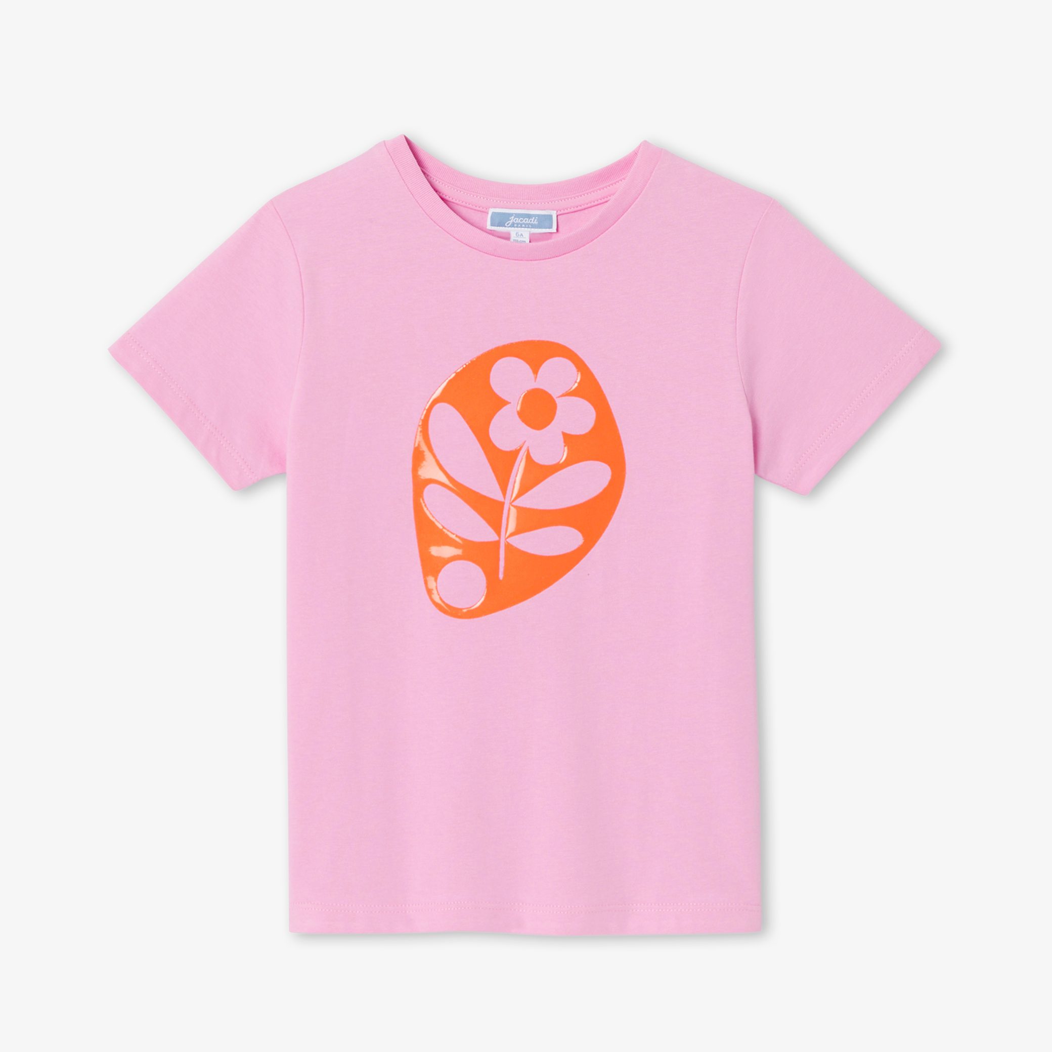 This retro-chic, spring-like t-shirt will find a place of choice in the early-season wardrobe. Adorned with a lacquered-effect flower, your daughter will wear it with flare trousers or a skort and Mary Janes for a geometric, colourful silhouette.