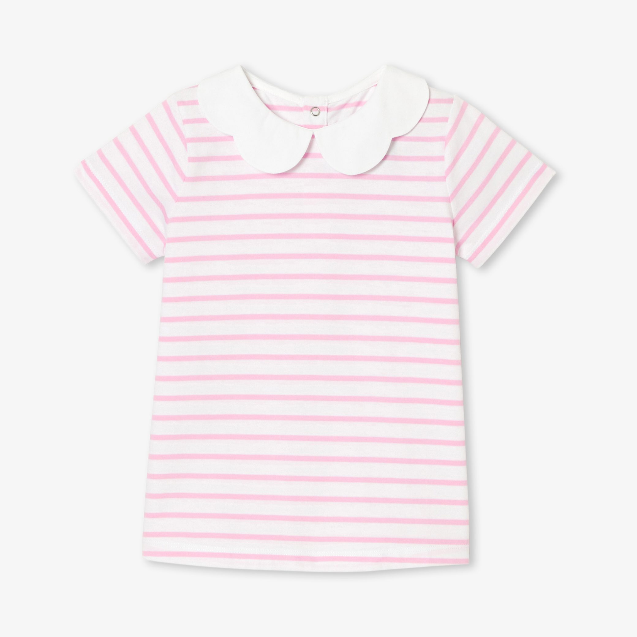This girl polo shirt adopts a casual chic look for spring. A sailor spirit with its fine stripes, a scalloped collar in poplin enhances this everyday model with a very Parisian chic, to be worn with wide jeans or a pleated skirt from spring to summer.