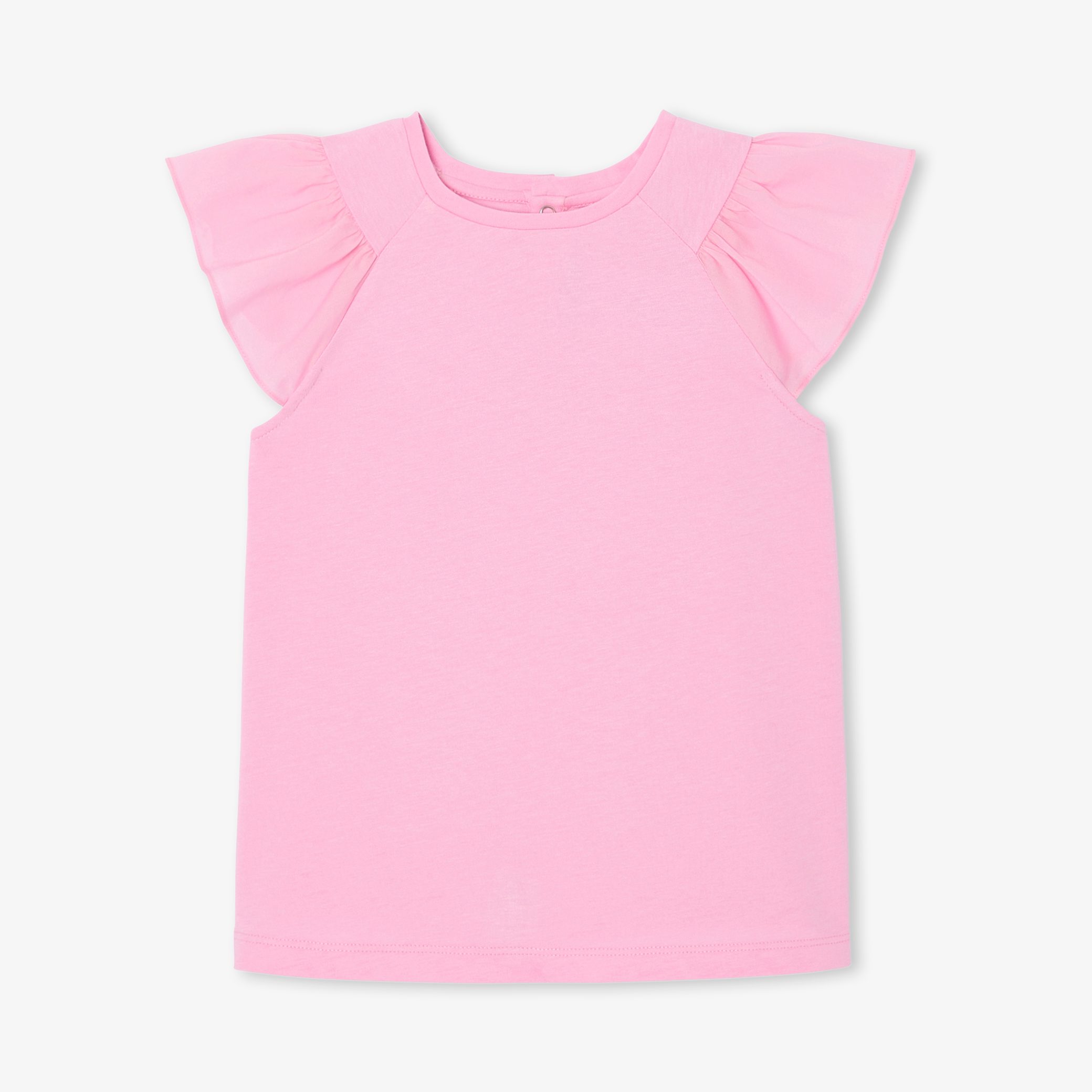 An everyday essential, this girl t-shirt is now more modern than ever. In soft, lightweight jersey, wide ruffled sleeves in cotton voile give structure to this model, which can be paired with a pleated denim skirt and sneakers for a chic, casual city silhouette.