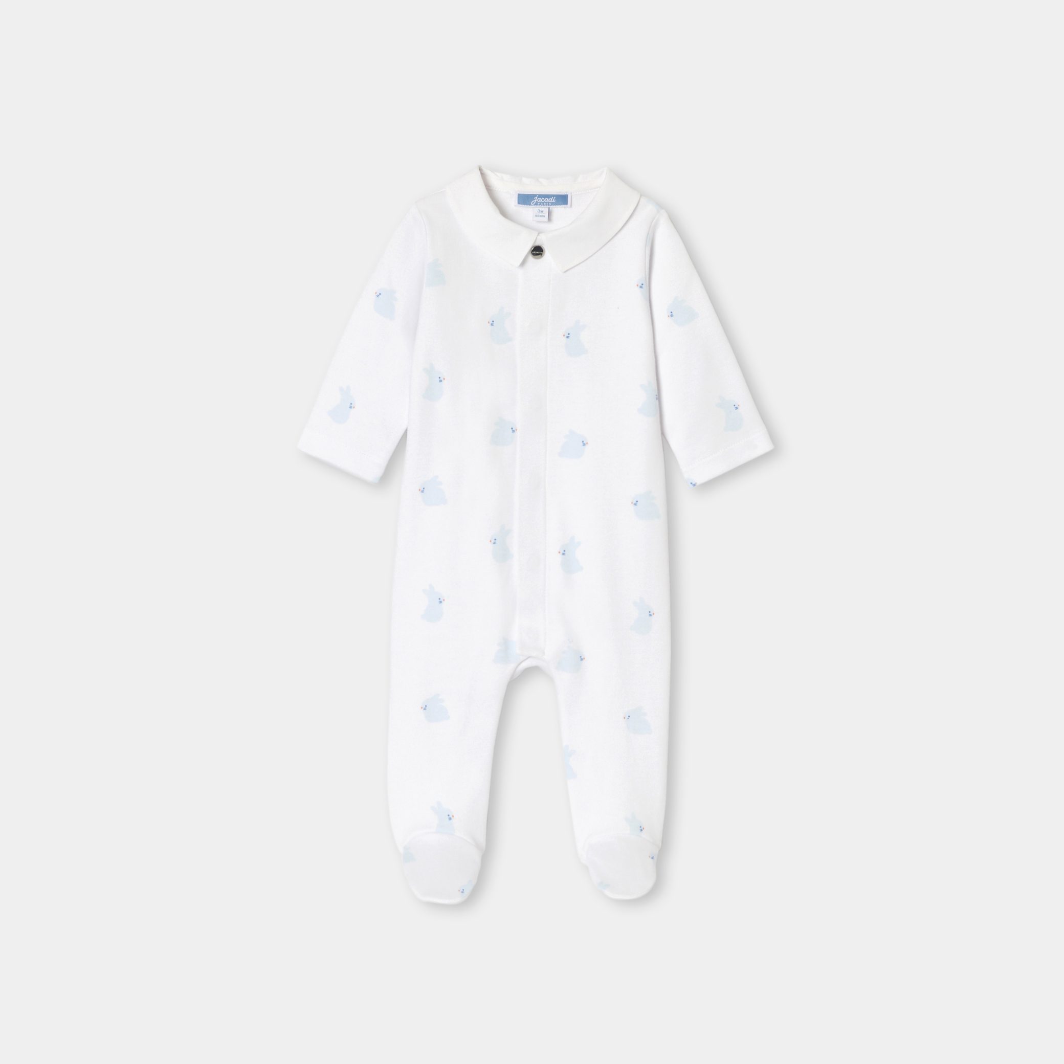 Elegant day and night in baby boy’s organic cotton interlock pyjamas. All-over print and featuring an elegant poplin collar, they open at the front with invisible snaps for easy, secure dressing. An everyday essential to slip into your hospital bag, it is perfect for putting together your newborn’s first trousseau.
