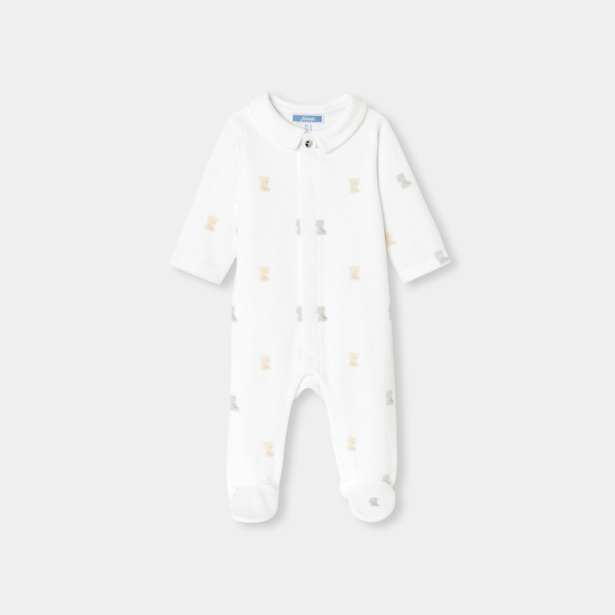 These essential baby pyjamas are adorned with an original print where tenderness and soft hues meet around little teddy bears. Made from soft velvet, this comfortable model is designed for everyday wear and promises a soothed sleep. The signature poplin collar enhances the design, while the invisible snap opening makes dressing easy and secure. A classic in the birth trousseau, ideal as a gift or as part of baby’s first wardrobe.