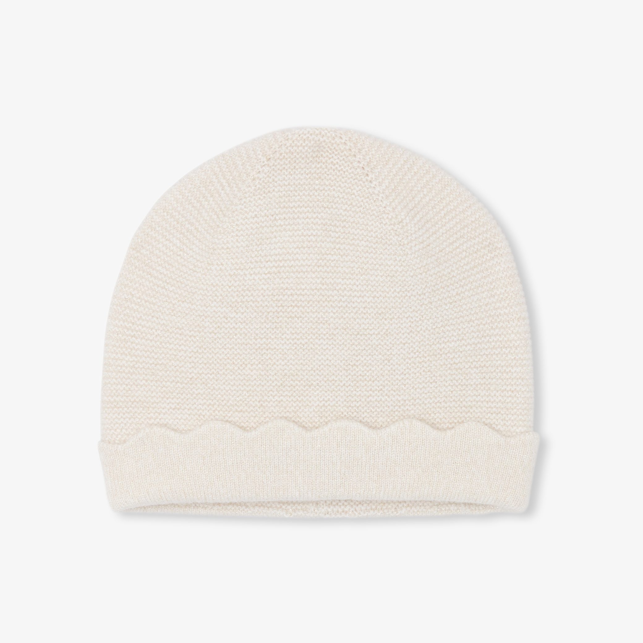 As soon as you leave the maternity ward and for all the days afterwards, choose the softness and elegance of this knitted hat to cover baby. Lined in microfleece and beautifully scalloped, its knit fabric is dotted with small gold accents. An everyday essential, pair it with matching booties.
