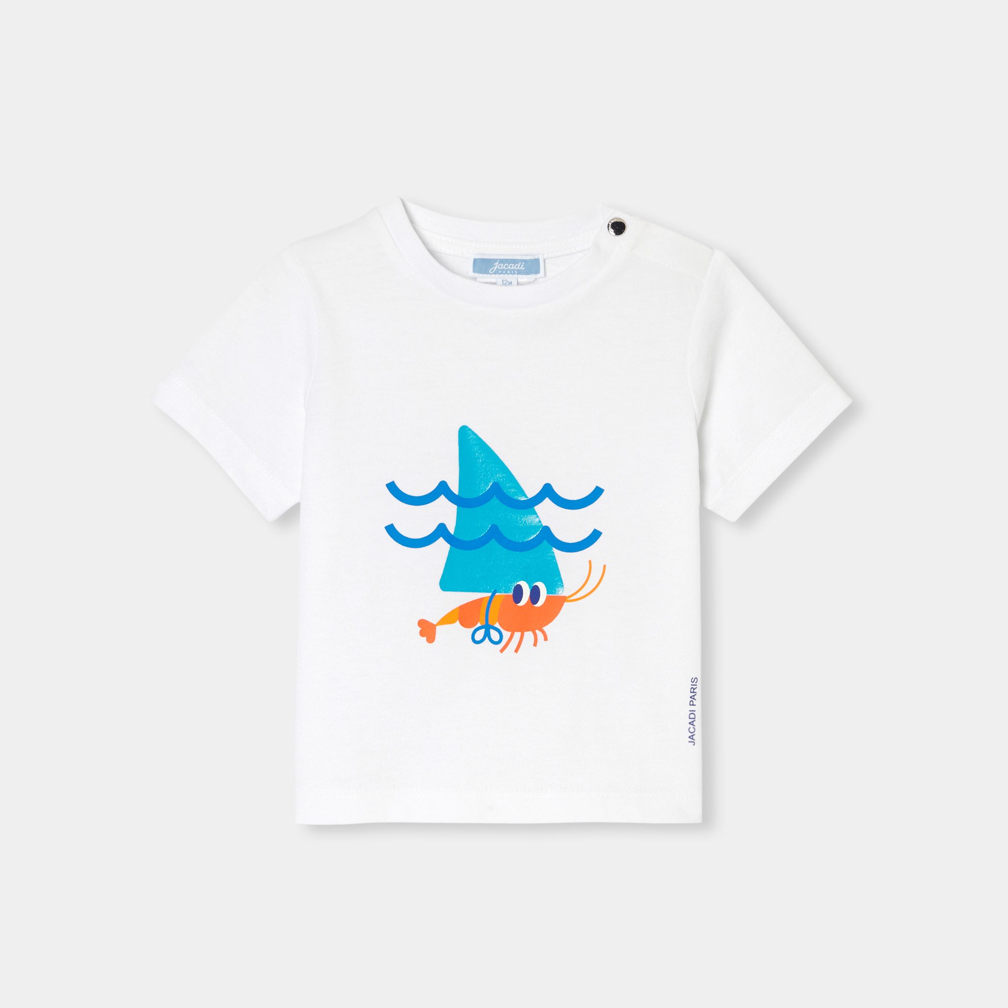 Playful and geometric, this baby t-shirt will bring smiles to young and old this summer with its little crayfish disguised as a shark. Pair with gingham shorts and a hat for the vacations and give this original design as a gift.