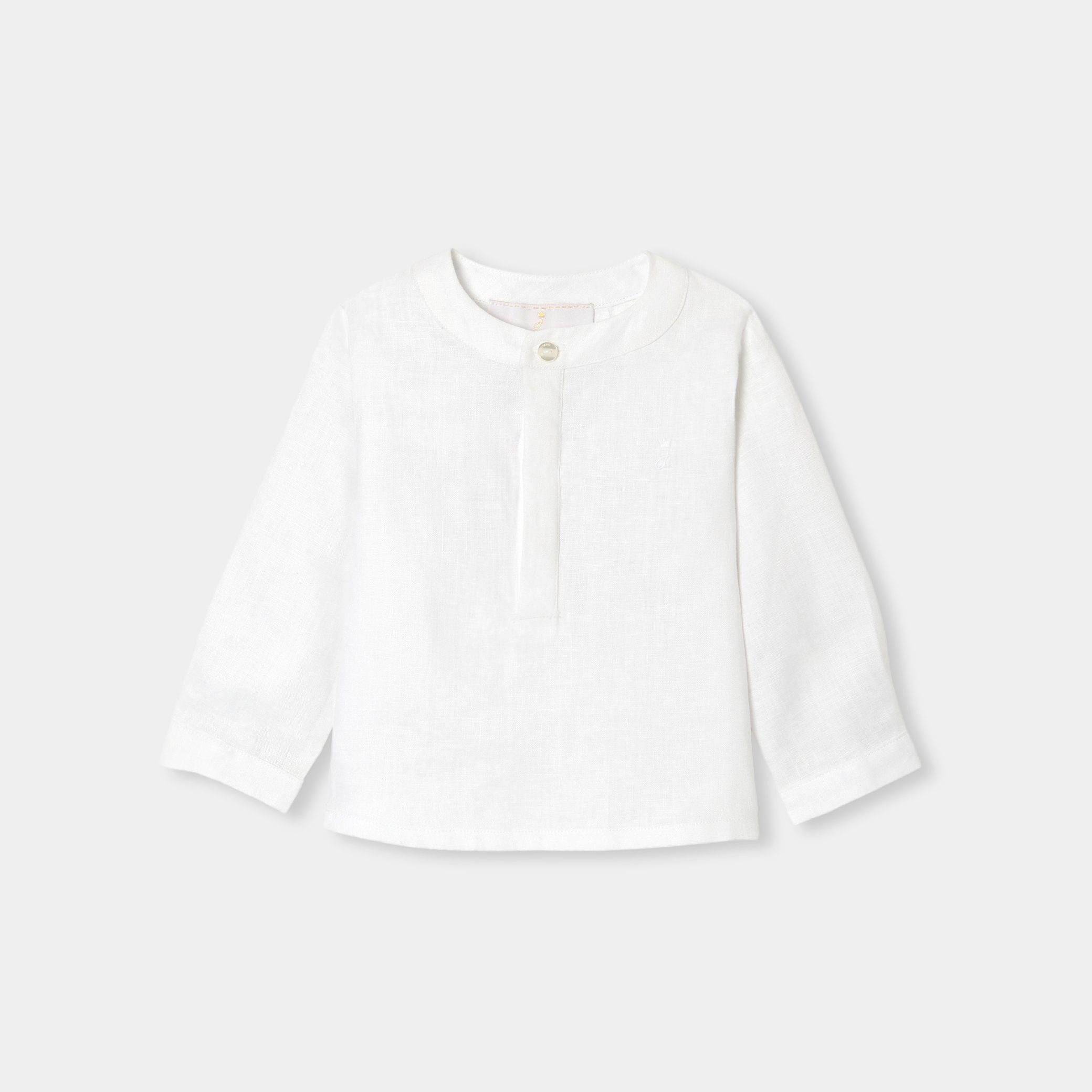 This chic baby boy shirt is perfect for formal wear. Made in linen and featuring a tunisian collar, match this elegant piece with smart trousers and a cardigan to complete his outfit on the big day.