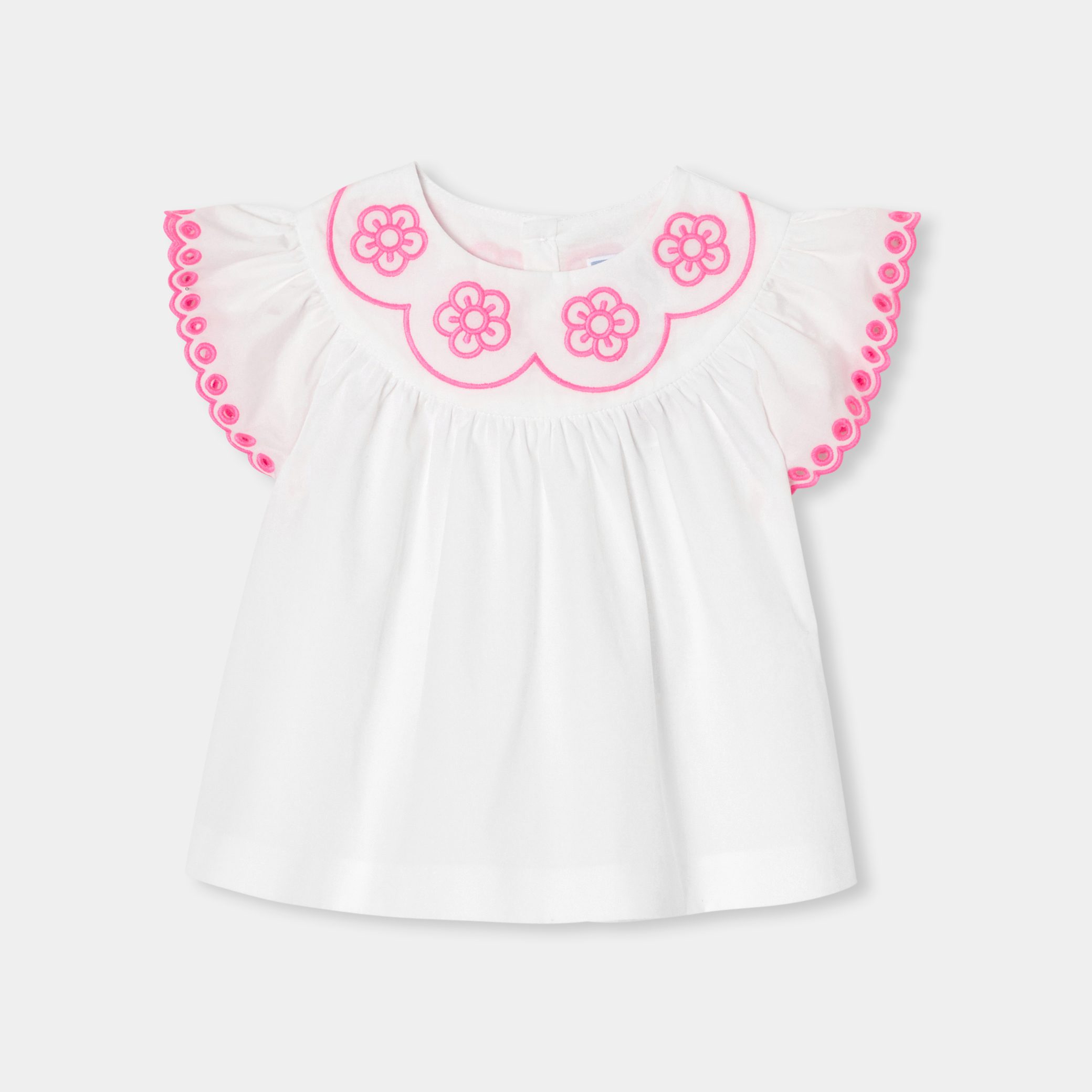 This baby girl blouse combines the charm of embroidered flowers at the neckline with the comfort of soft, lightweight cotton. Embellished with ruffled sleeves for volume, pair this folk-chic piece with jean shorts and sandals.