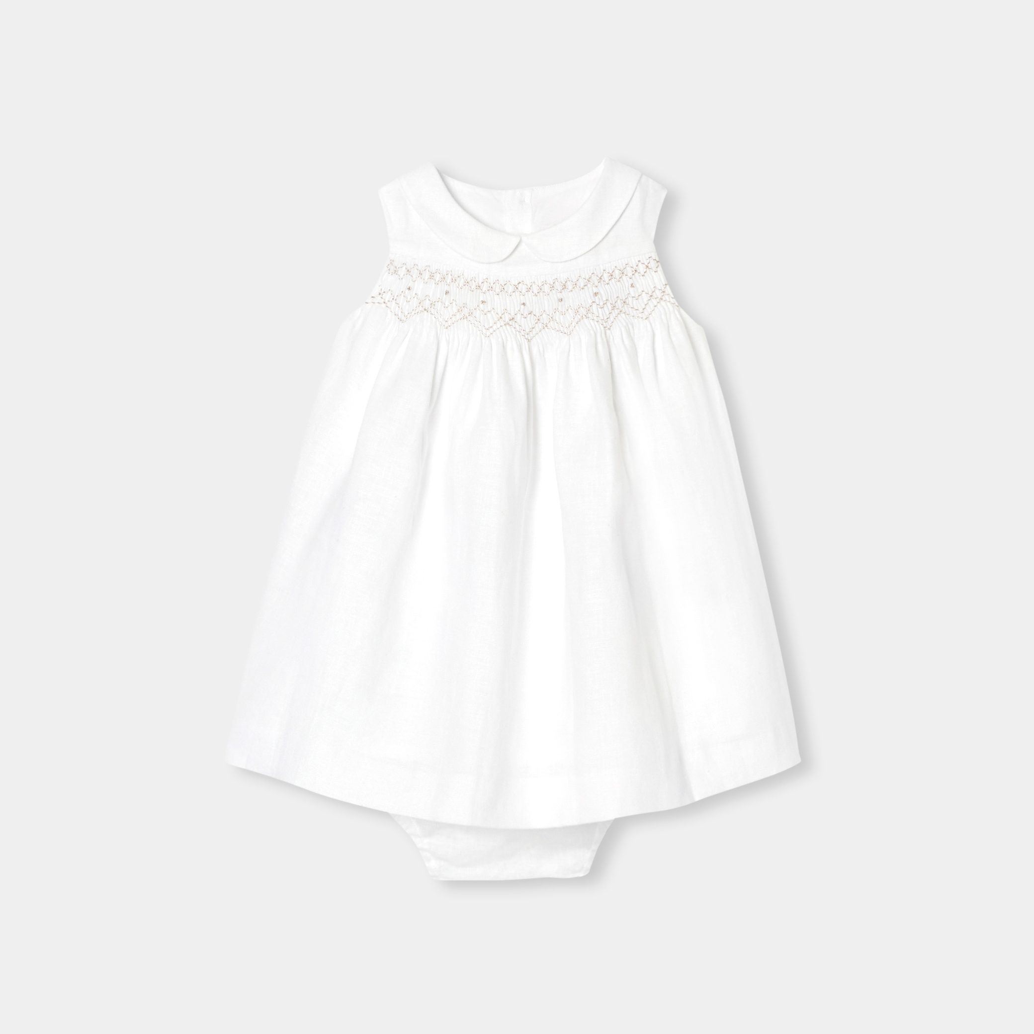 Embellished with impeccable silver thread smocking and a suspended waist, this baby girl ceremony dress comes in linen for a chic, authentic silhouette perfect for the big day. Complete with elasticated bloomers, match this lovely piece with a hat and sandals for upcoming events.