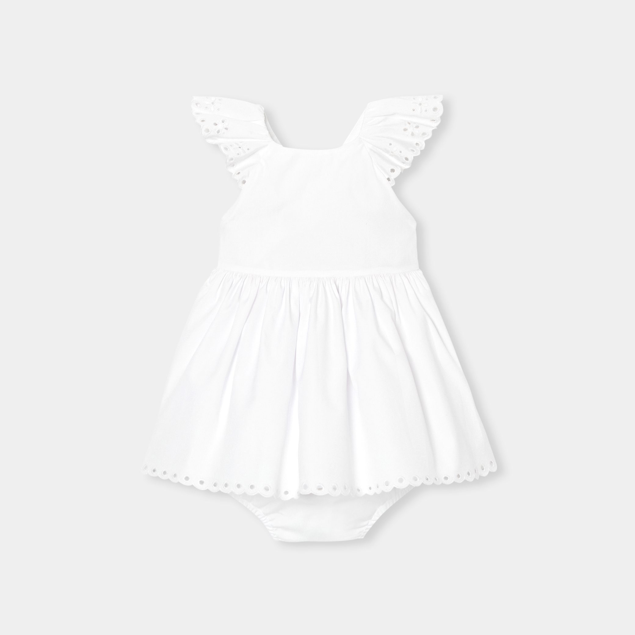 At the height of the special occasion season, this baby girl dress is the perfect choice for any invitation. In praise of French elegance and savoir-faire, voluminous sleeves, crossed-back straps and French embroidery mark this chic, geometric model to match with sandals and a hat on the day of the ceremony.