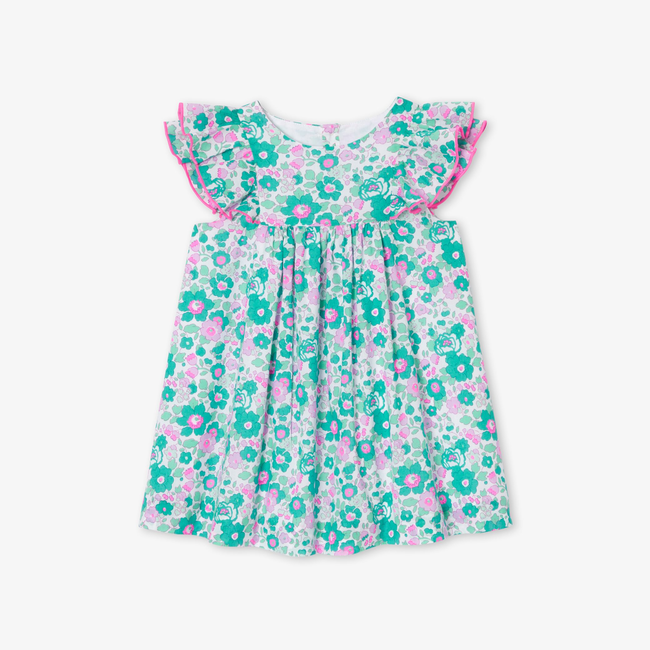 In enchantingly colourful Liberty fabric, this baby girl dress transports you into a folk and floral mood. Accessorised with neon pink double ruffled sleeves and pretty pleats on the front and back. This piece, to be worn from spring onwards with a cardigan or wadded Liberty jacket for a romantic total look, will be part of every outing.