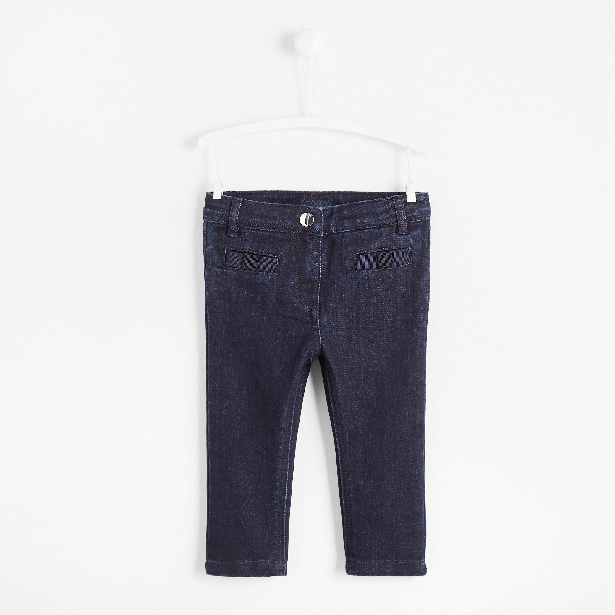 – Comfort denim – Waist adjustable from the inside by elastic – Zip and snap button closure – Flat grosgrain knots on pockets |