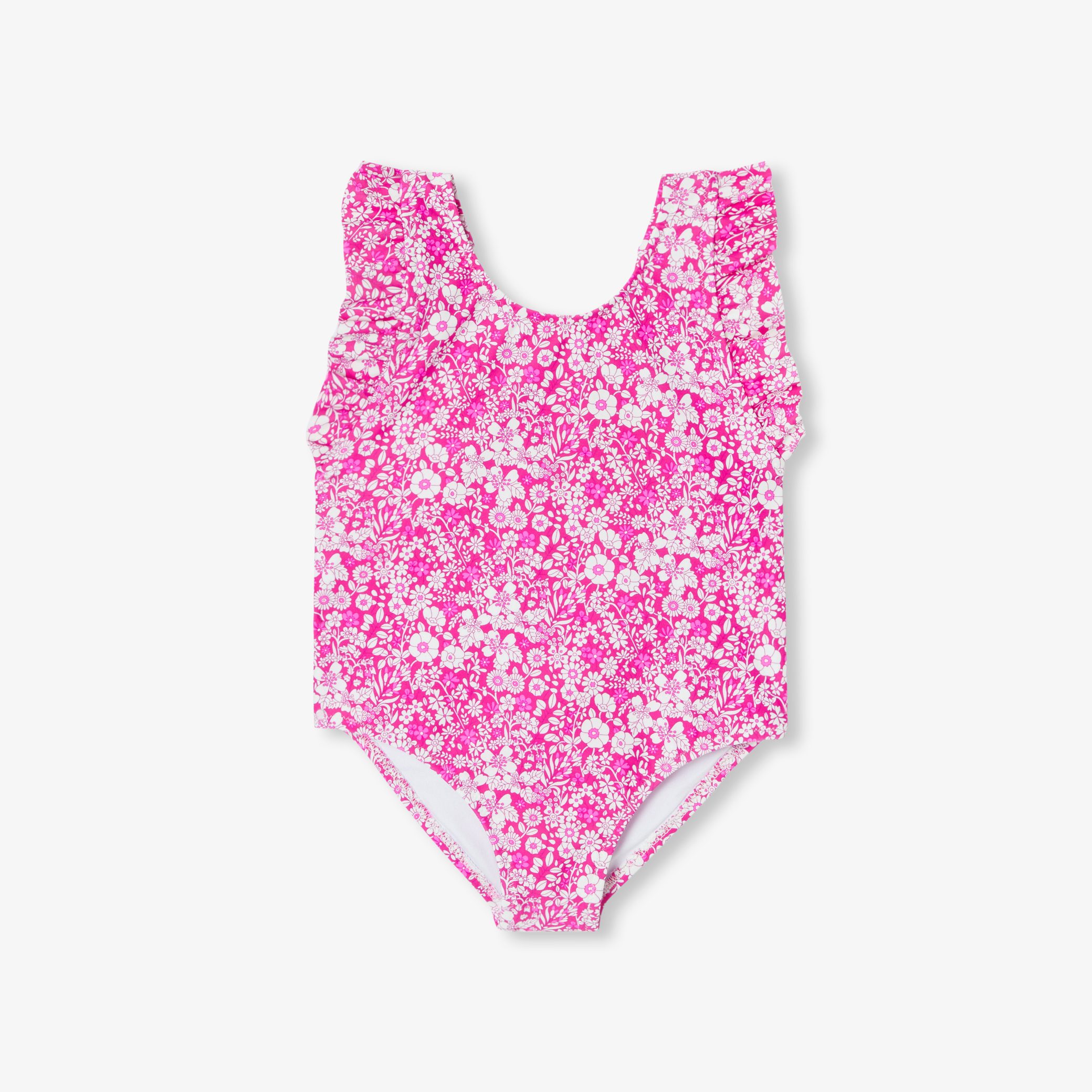 Printed with a Liberty fabric bursting with energising colour, neon details dot this baby girl swimsuit to give as a summer gift. Beautifully ruffled on the armholes and straps, match it with the hat for her first trips to the beach.